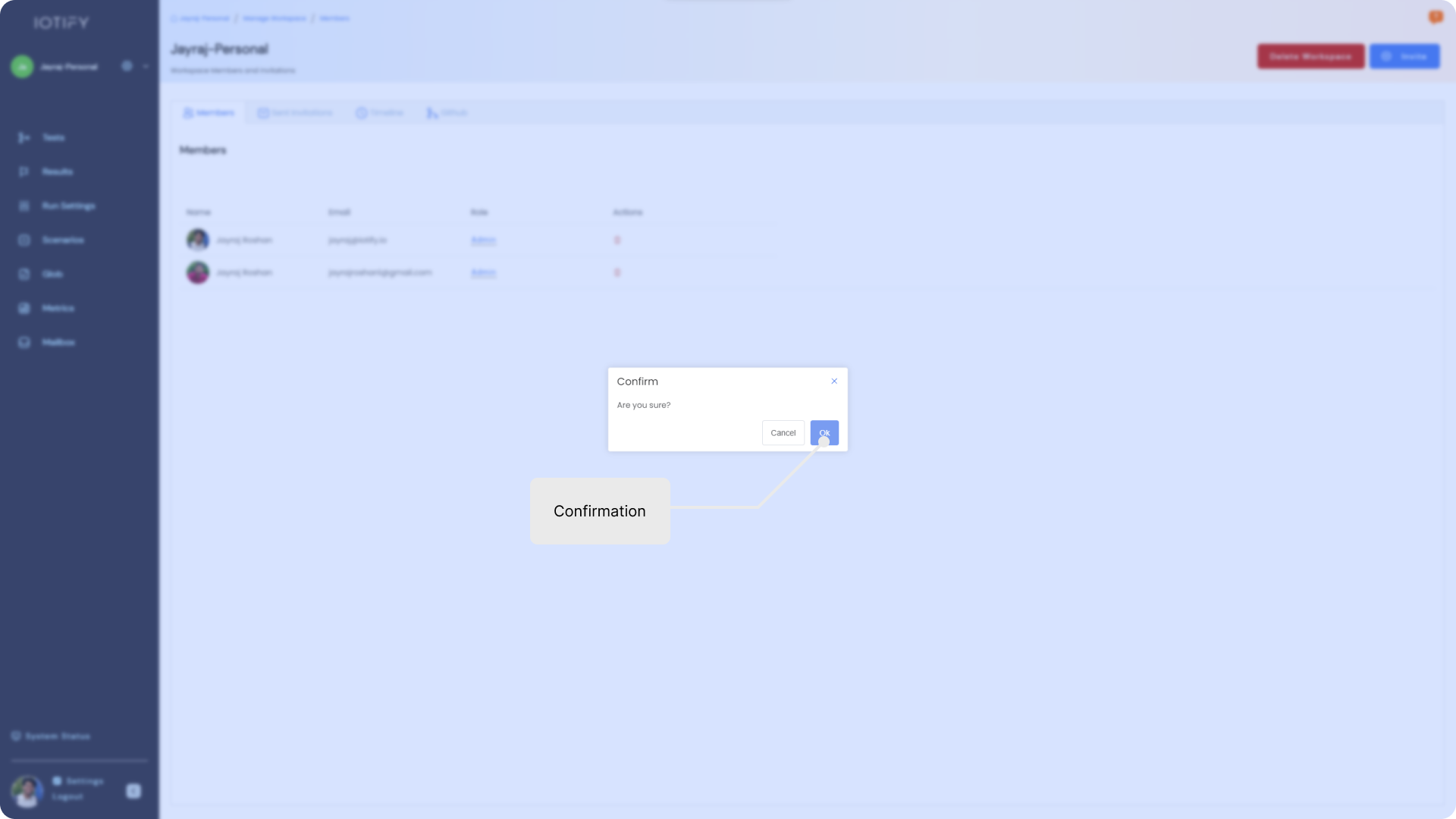 A popup will appear asking you to confirm whether you want to delete the workspace, click on Ok. If you have valid permissions, the workspace and all its entities will be deleted.